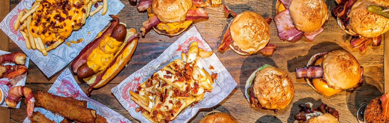 2 burgers de 140g, queijo cheddar e muçarela, bacon 100% artesanal especial de lombo e maionese de bacon no pão brioche de mandioquinha